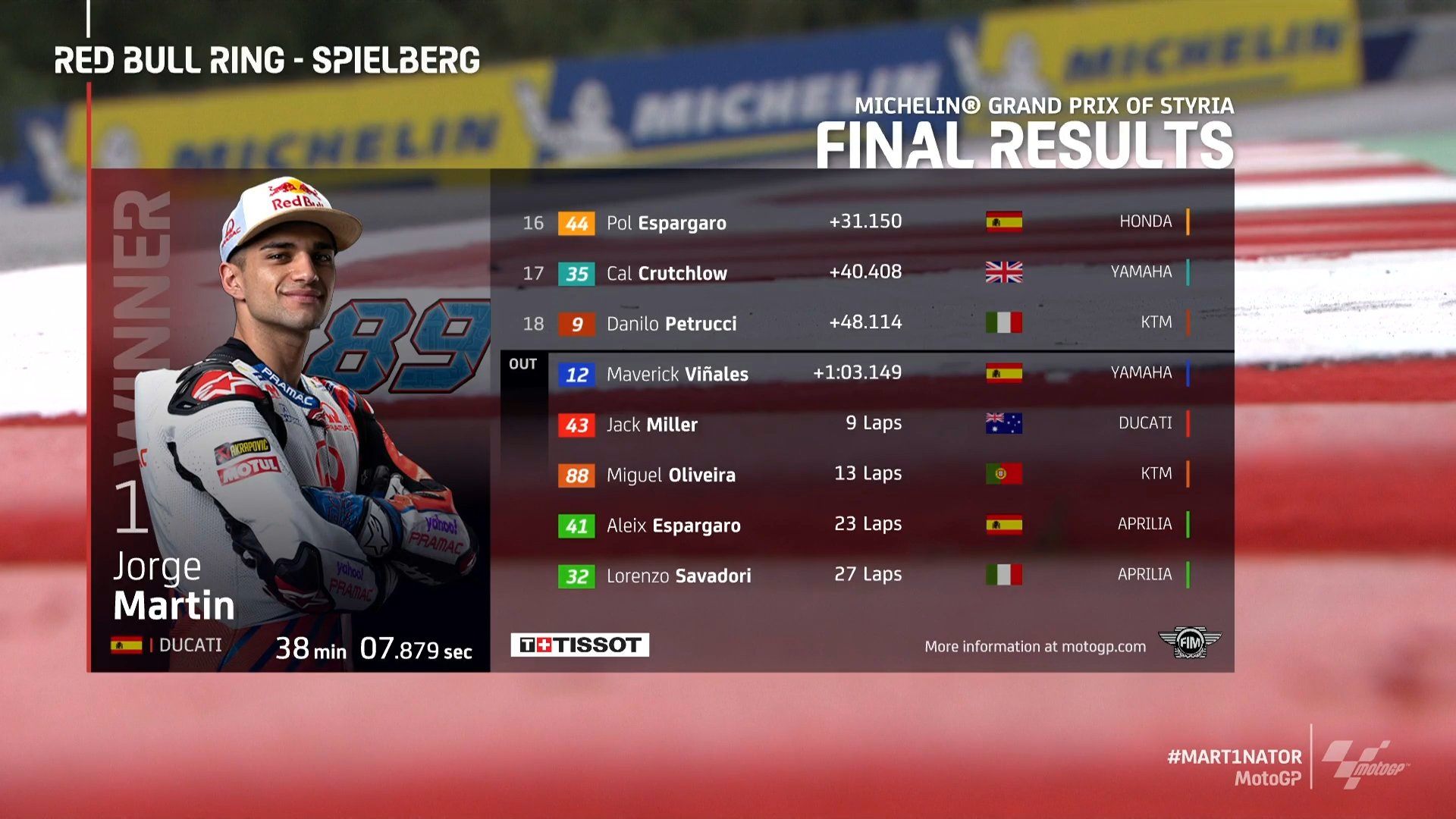 Motogp On Twitter 88jorgemartin And Pramacracing Storm To Maiden Motogp Victory Joanmirofficial Takes Second Ahead Of Championship Leader Fabioq20 Mart1nator Styriangp Https T Co Xh7xeaaozj